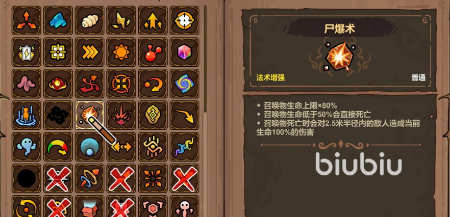 游戏内的魔法数量极为丰富,涵盖攻击、防御、辅助等多种类型。玩家们在前期使用初始解锁的基础魔法就可以轻松消灭低阶怪物,但随着游戏推进,怪物的血量与防御逐渐提升,玩家们需要解锁并搭配更强大的法术能力。比如说“聚爆”,这一法术能通过压缩作用范围换取高额伤害增幅,每减少一定半径就会提升大量最终伤害,适合搭配高基础伤害技能秒杀精英单位,不过它无法通过常规合成获取,只能通过特定事件或BOSS掉落获取。