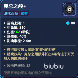 召唤上限和频率够,最后的思路就是提升伤害,克总之颅有一个特性,可以获得法杖最大魔法值10%的秒伤,这一特性和“奥术屏障”的效果非常搭,“奥术屏障是法杖魔法值越多越能抗伤害。