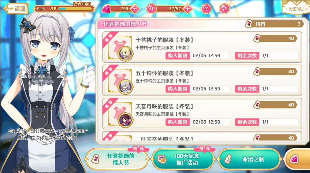 第2种服装获取方式就会比较麻烦一点。以现在正在进行的情人节冬装为例,玩家在这次活动中可以获取到十咎桃子、五十铃铃、天音月咲和二叶纱奈的冬季服装,而兑换所需要的情人节礼物,数量也仅仅只需要40个一位而已。