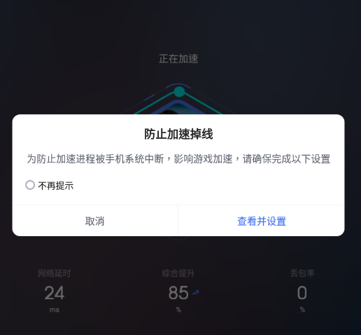 在玩家初次为游戏加速时,会出现如下提示,玩家只需要选择“查看并设置”后,跟随教程步骤一步步完成相关设置,就可以防止出现加速掉线的情况,保证加速进程流畅。