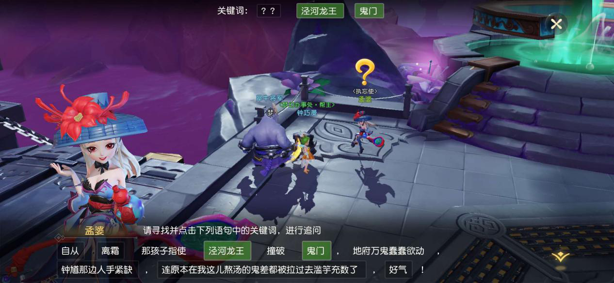 第三步,给其他鬼魂喝下孟婆汤之后,选择关键词泾河龙王、鬼门和离霜三个,对话后去找崔判官,随后向阎王禀明情况,这里选择对话需要慎重,顺序是判官确实去修复了、刚刚发现、忙于度化长安亡魂就可以了,千万不要选错,不然会导致严重后果。