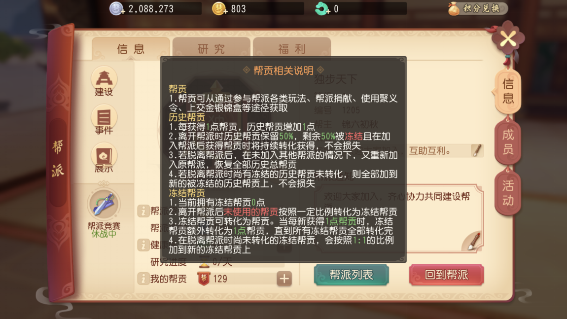 当我们退帮后历史帮贡会保留一半,而另一半的帮贡则会被冻结起来,直至我们重新加入新帮派后会自动解冻继续获得。
