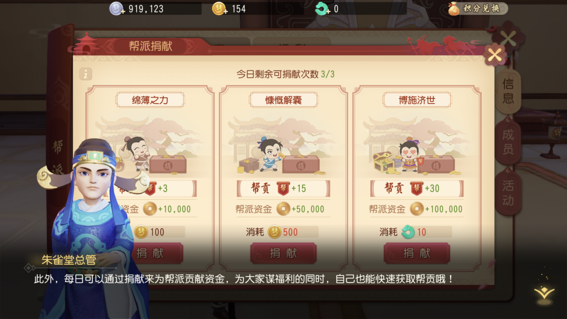 帮派捐赠分为三档,100金币增加3帮贡,500金币增加15帮贡,10灵玉增加30帮贡。