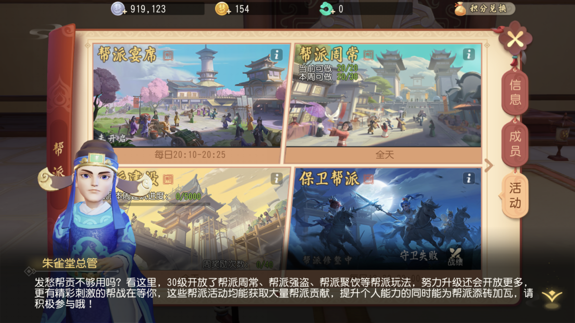 帮派活动分为帮派宴席、帮派周常、帮派建设、保卫帮派。