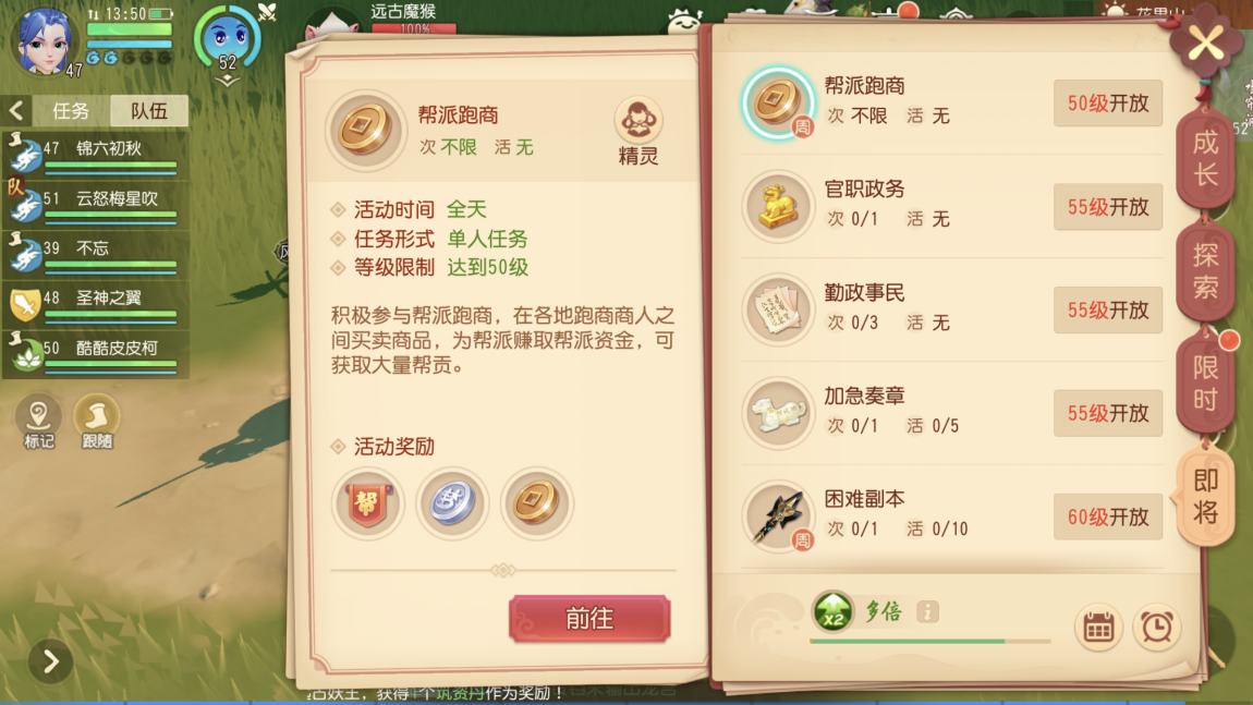 帮会跑商活动不同于帮会一般活动,他不仅可以获得帮贡还可以获得大量钱财,需要我们达到50级,通过与个场景商人做买卖获得目标额度的帮派银票完成任务。