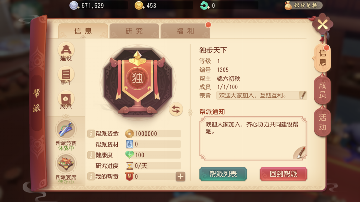 达到一定等级后新手指引会教我们如何加入帮派,我们可以选择直接加入已建好的成熟帮派,或者自己存钱创建自己的帮派。