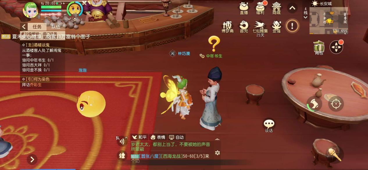 第一步是店里的客人依次谈话,了解酒楼闹鬼的事情,这一步比较简单,只需要和场景中带有黄色问号的NPC依次交谈就可以,值得注意的是和金不换对话,建议选择替他出钱治病,这样比较简单。