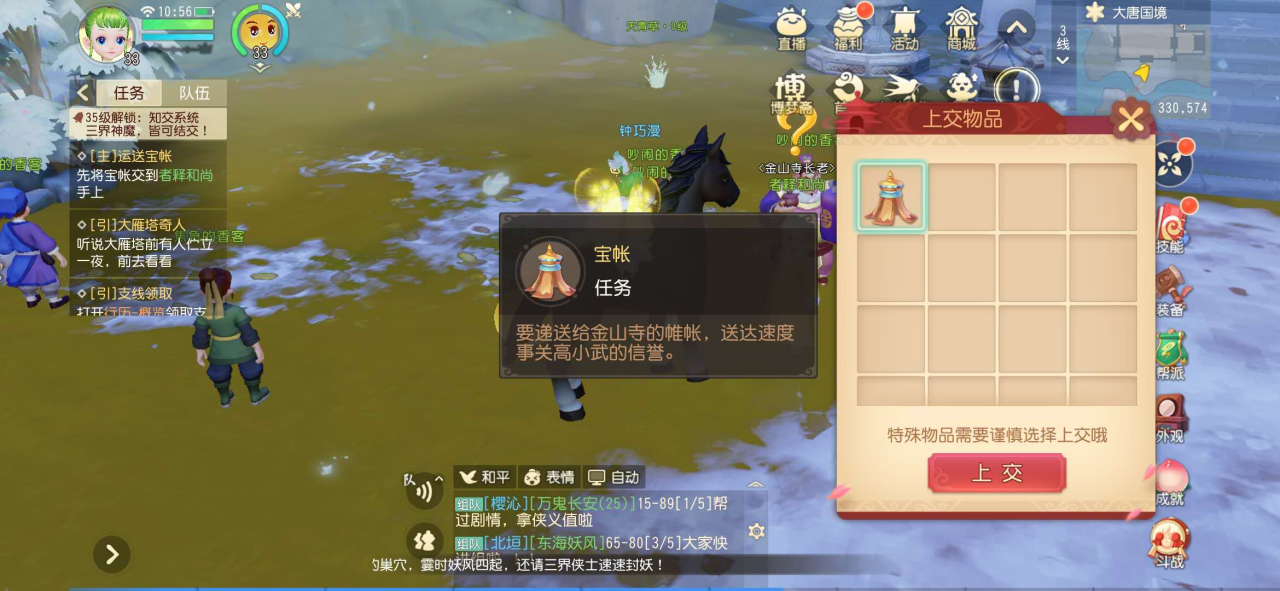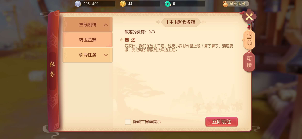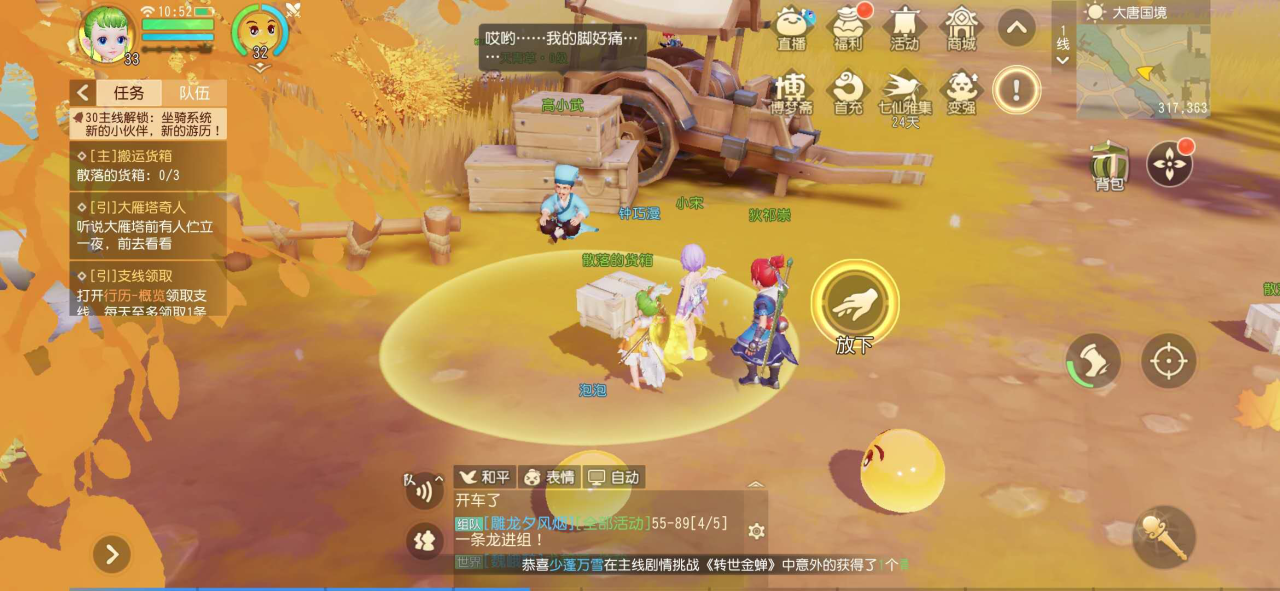 第一步,来到大唐国境处和李顺风对话,随后帮忙把地上的箱子搬到车上去,在地上可以看到很多散落的箱子,靠近后点击搬运,随后把箱子放到图上的光圈位置就可以了。