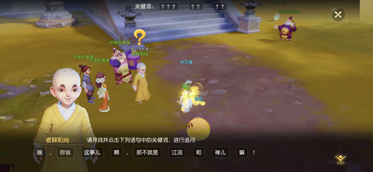 第三步,向帷帐僧人上交宝账,随后为上香的香客解决麻烦,这时选择通过战斗途径就可以,非常简单。最后需要对关键词进行筛选,点击选择其中的这事儿、江流和婵儿就可以。