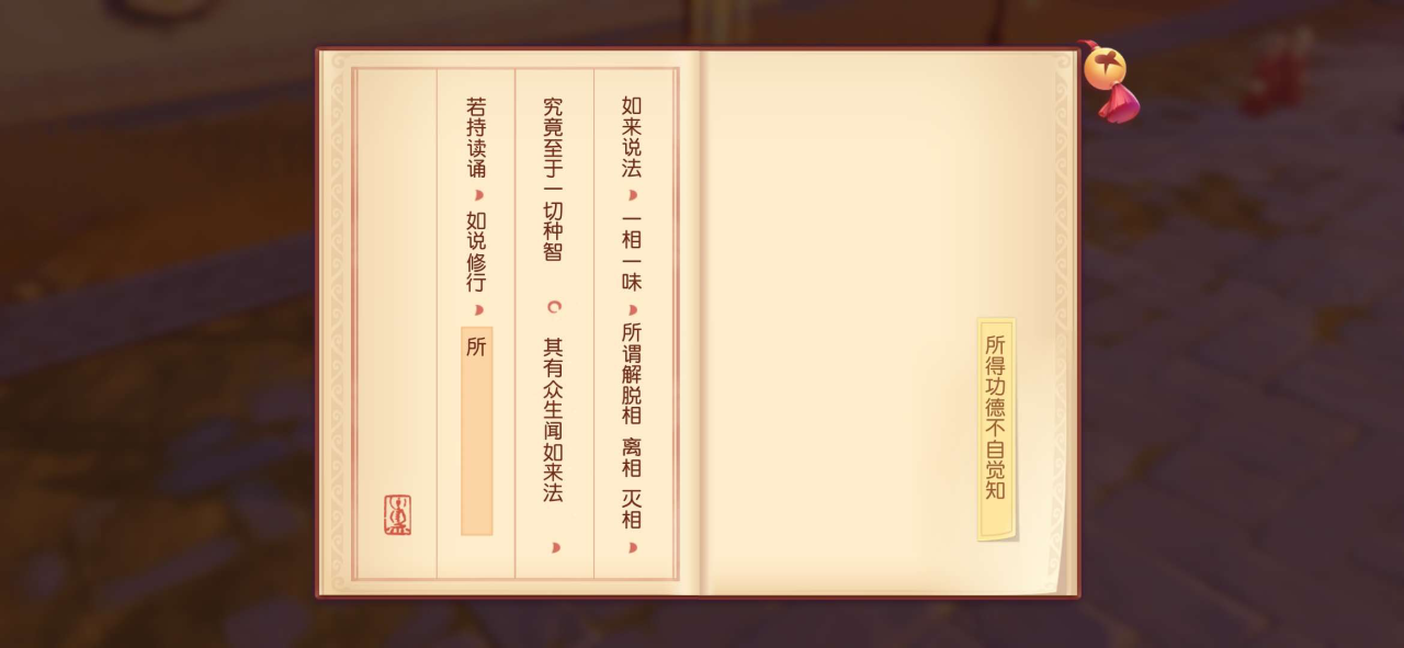 第四步,找到婵儿,选择再打一次武僧,结束后和婵儿对话,需要选择合适的经文拖入框中,按照每句话的第一个字选择就可以。随后向僧人发放经文。