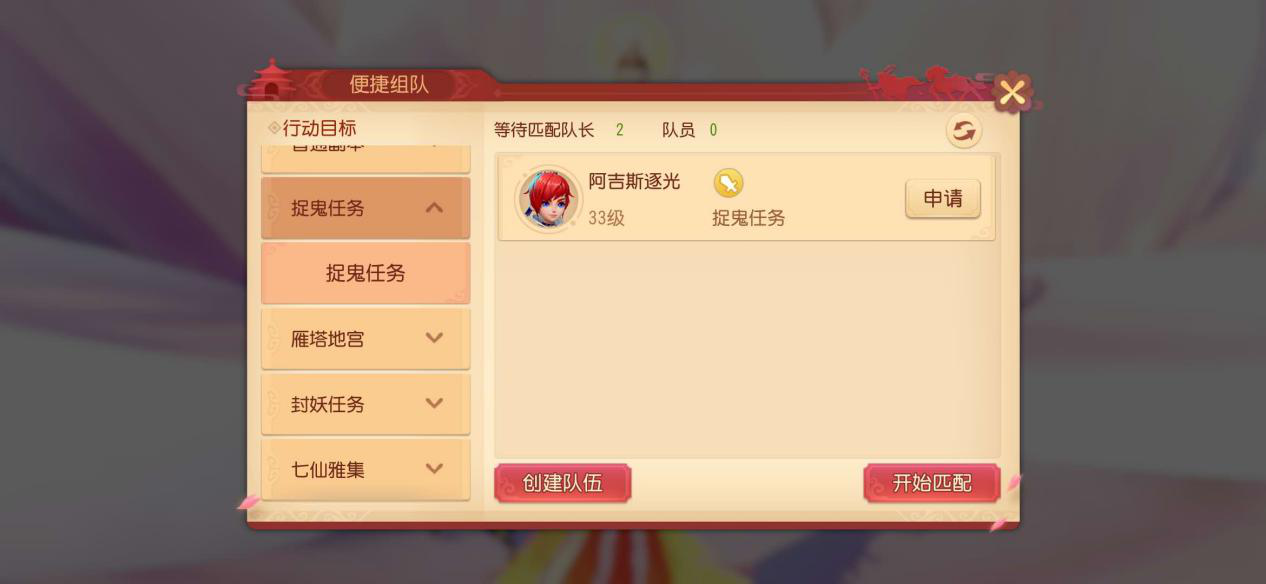 点击任务中的快捷组队,就可以在现有的捉鬼队伍中选择一个加入,如果没有队伍的话,还可以自己做队长,抓鬼活动当队长是可以获得额外奖励的,所以喜欢动手的朋友完全可以成为队长。