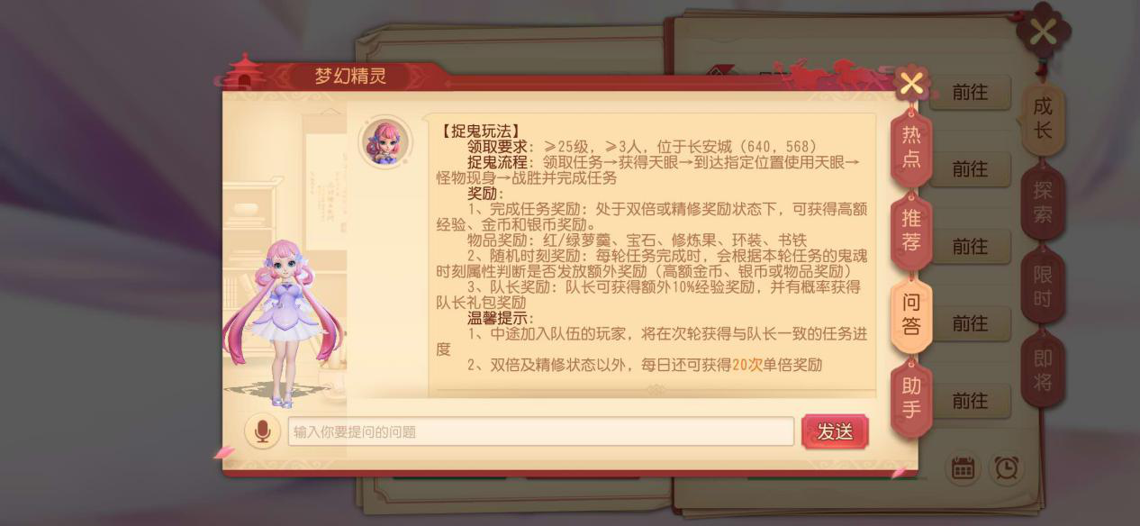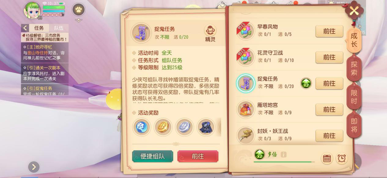 抓鬼是玩家等级达到25级开启的活动,需要玩家之间组队才可以领取,点击游戏主界面上的活动选项,在成长任务一栏中就可以看到捉鬼任务了。