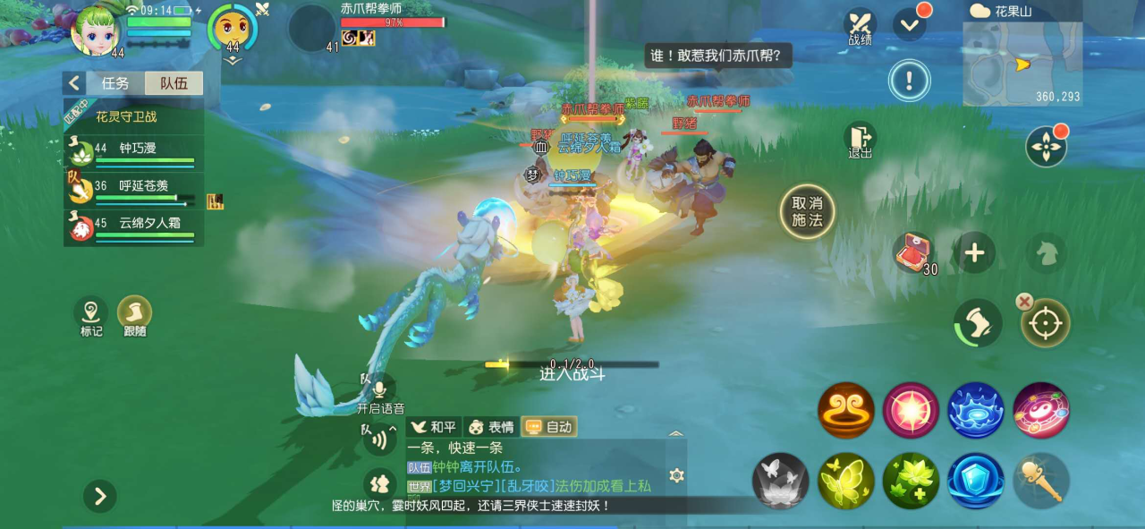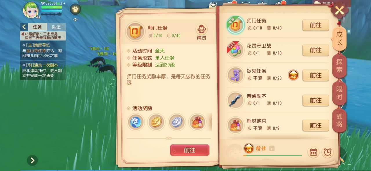 花灵守卫战就要难一些,需要组队进行战斗,玩家可以在快捷组队功能中寻找相应的队伍,在长安的七仙女赤霞处,由队长接取任务,每个玩家每天只能完成一次花灵守卫战活动,继续战斗就不能获得经验了。战斗的难度在目前来说还是比较大的,如果不注意队伍搭配是完不成的。