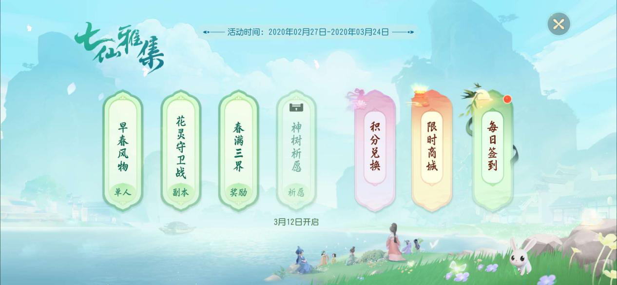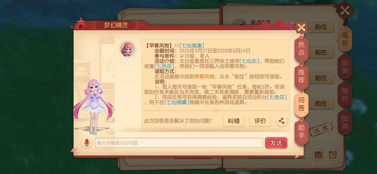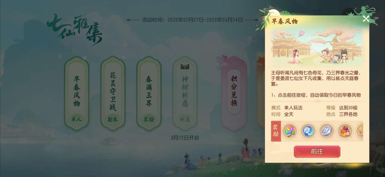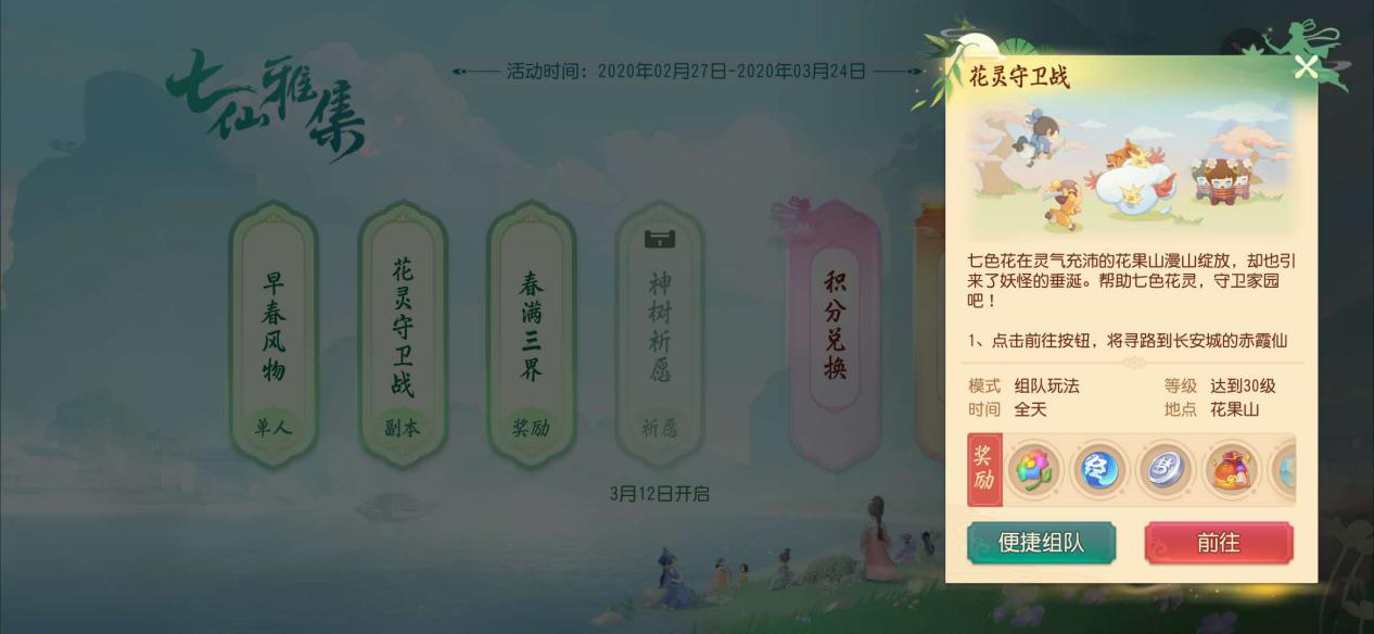 点击游戏主界面上的七仙雅集,可以看到本次活动共包括两个任务,一个是单人任务春风早物,另一个是组队任务花灵守卫战。这两个任务都是全天任务,所以灵活度非常高。