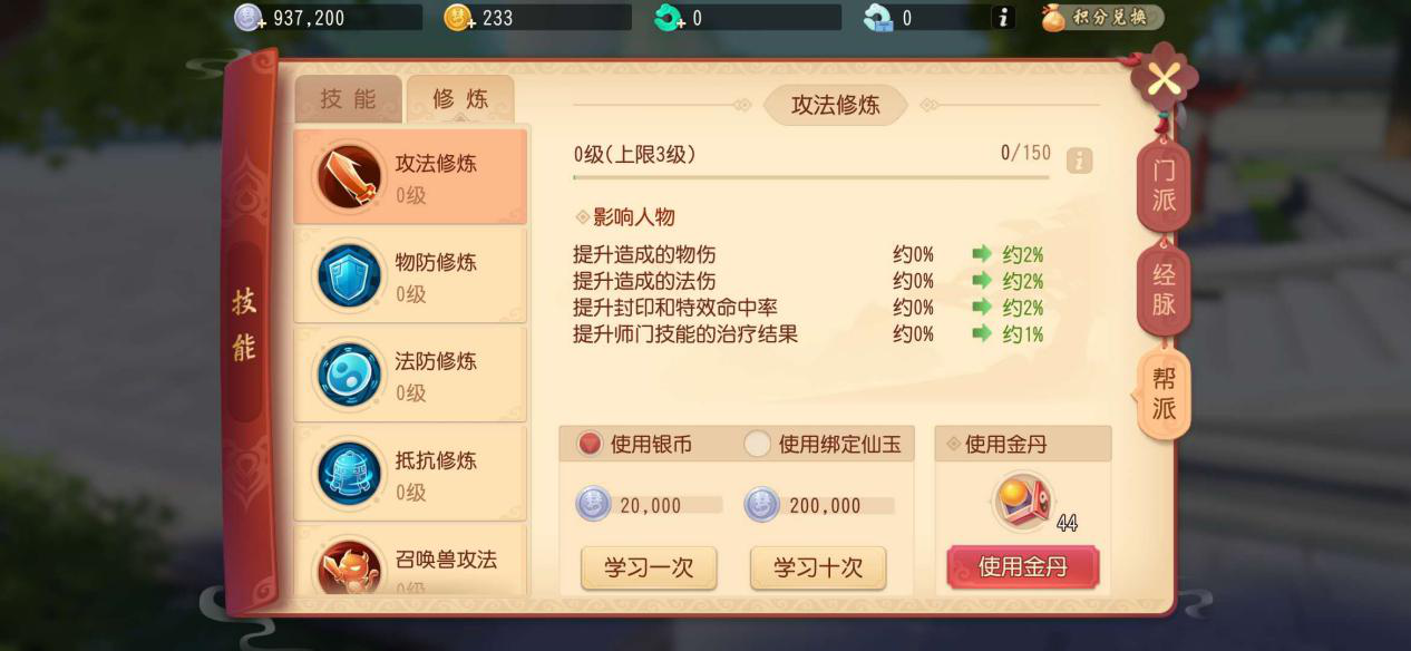 第六个方面是人物修炼,修炼同样是在帮派中进行,修炼分为攻击修炼、物防修炼、法防修炼、抵抗修炼和召唤兽修炼等。修炼需要消耗银币或修炼金丹,修炼后可以按照比例增加对应属性,对评分影响非常大。小编建议大家在前期优先进行攻击和防御的修炼,这样增加的评分最多。