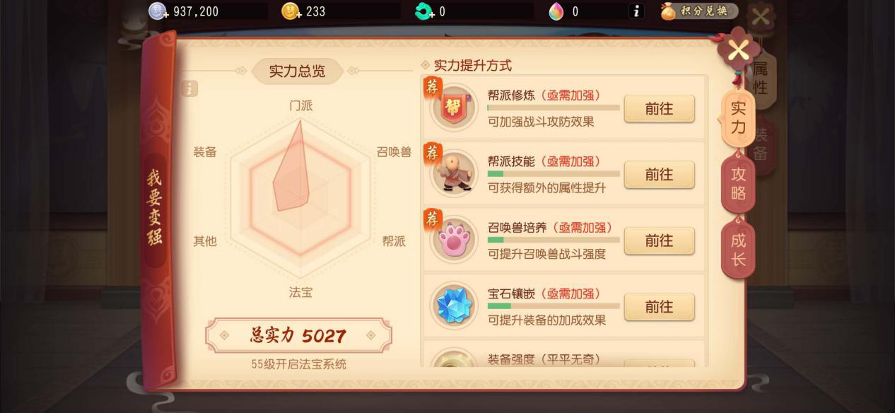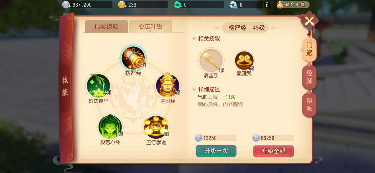 第五个方面是技能等级提升,技能又分为门派技能和帮派技能,学习门派心法一是可以提升门派技能效果,二是可以增加技能附带的属性值,例如普陀的心法楞严经可以提高气血值,五行学说可以增加法攻等。