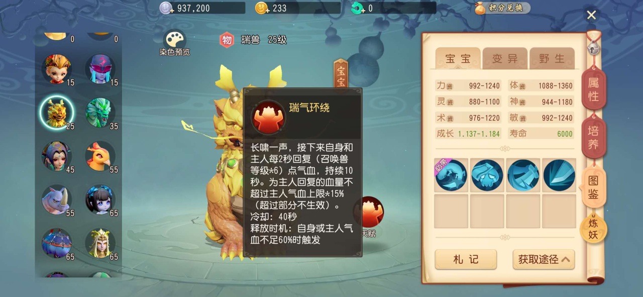 瑞兽自带再生、驱鬼、练级和暗刃技能,优点是体力资质比较高,成长最多可以到1.184,瑞兽最重要的一点是自带驱鬼技能,攻击带有鬼魂术的目标时可以提高对鬼的伤害,所以在抓鬼的活动中非常有用,小编建议大家一定要搞一只用来抓鬼,可以极大地提升效率。瑞兽可以在地图花香香中捕捉到,也可以在商城中购买。