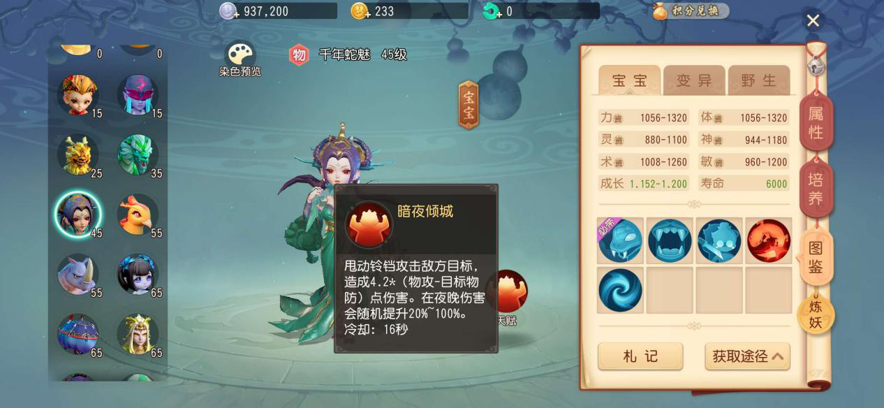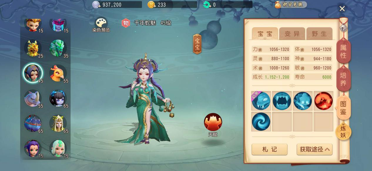 先来看一下45级时可以携带的宠物有哪些,其中有0级可带的泡泡,15级可以携带的小悟空和野鬼,25级可以携带的瑞兽,35级可以携带的蛟龙,以及45级可以携带的千年魅蛇。