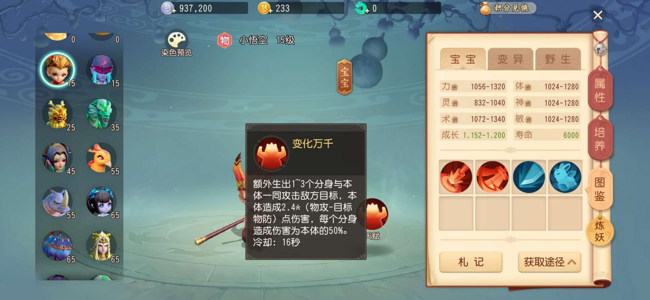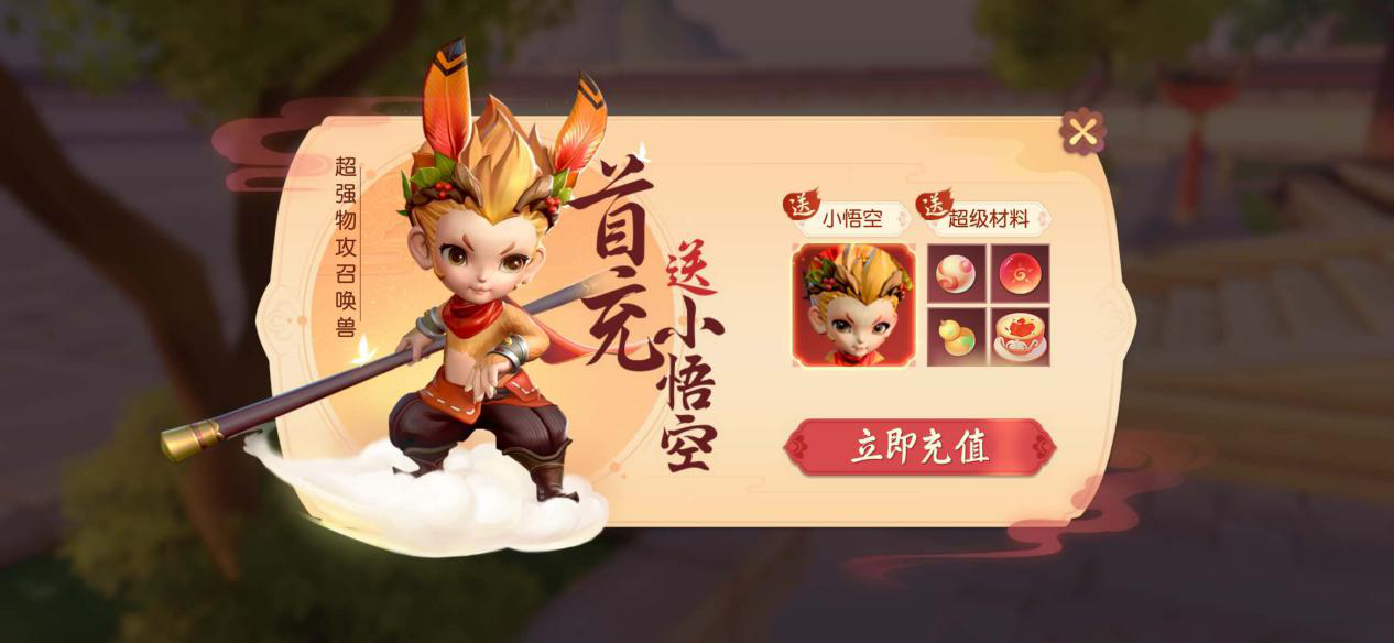 小悟空虽然是15级宠物,不过自带高级精准,高级连击和暗刃以及神佑复生技能,力量资质在1320左右,成长可以达到1.2,可以说技能和资质一点都不比高等级召唤兽差。天赋是变化万千,可以变化出分身来帮助战斗,分身能造成50%的伤害。而且现在首充就可以获得小悟空,非常方便大家培养。