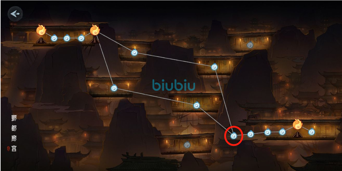 2、在进入到酆都廊宫关卡之后,走到分支地点按照(上、下、上)的顺序就能够找到琴女了。小编会在图中的位置标注出琴女最终所在的位置,大家也可以自己琢磨一下这个地图。