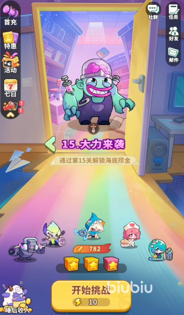 最后是“海底捞金”玩法,通关15关就能解锁该玩法,在副本限定时间中击败章鱼首领,就能获得通关宝箱奖励,同时解锁后续更高的难度,假如挑战失败,也可以通过免费次数继续挑战。