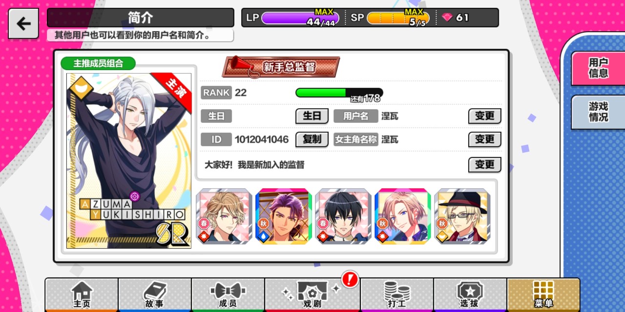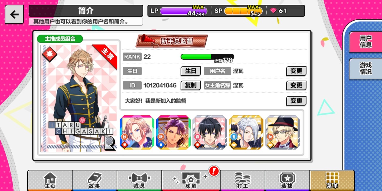 首先我们需要找到自己的头像在哪里,并且确认它是什么样子之后,再进行更换。单击首页下方的菜单功能,其中有简介这一项,点击进入后可以看到玩家个人的信息面板,其中左侧最大的卡面是作为玩家的头像在好友圈列表里面出现的。