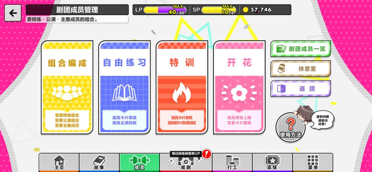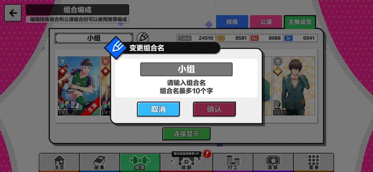 第一步,大家需要在游戏界面的下方点击成员,在剧团成员管理页面中找到组合编成,在组合编成可以变更排练组合、公演组合、主推成员。