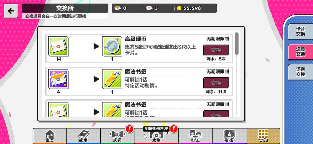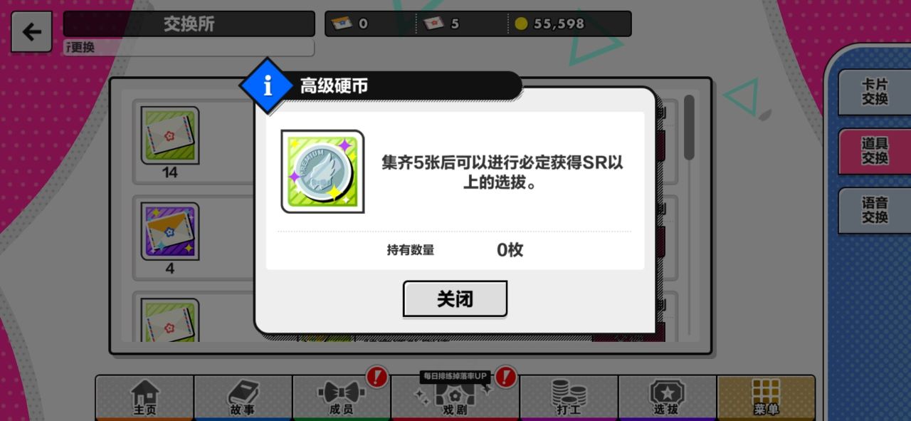 但是在一定的时间内只能有五次兑换高级硬币的机会哦,折合下来一共就能兑换五个高级硬币,可以在高级选拔中抽一次剧团成员。