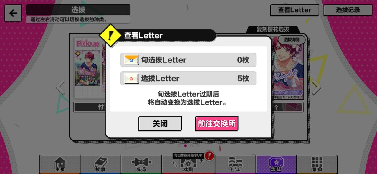 在剧团成员选拔活动的右上角"查看letter"就可以查看已经获得的选拔letter了。选拔letter够五个的时候就可以直接点击"前往交易所"兑换高级硬币了。