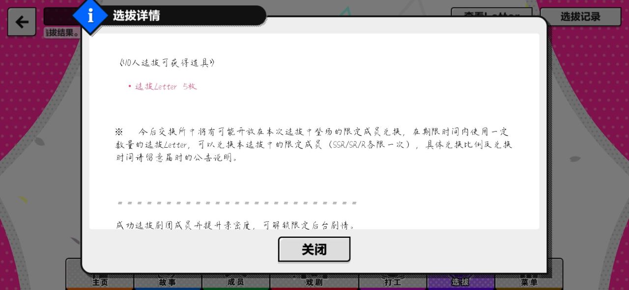选拔letter还有另一种获取方式,就是可以由已获取的旬选拔letter获取,旬选拔letter过期后就会自动转换为选拔letter。