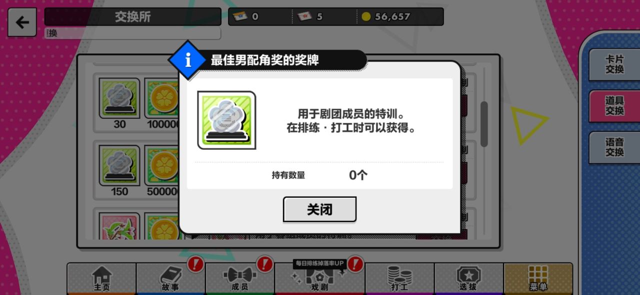 而最佳男配角奖的奖牌可以通过排练和打工获得,排练需要消耗lp值,lp值没了也要用钻石买或者等着恢复。打工也不是一直可以进行,有冷却时间。