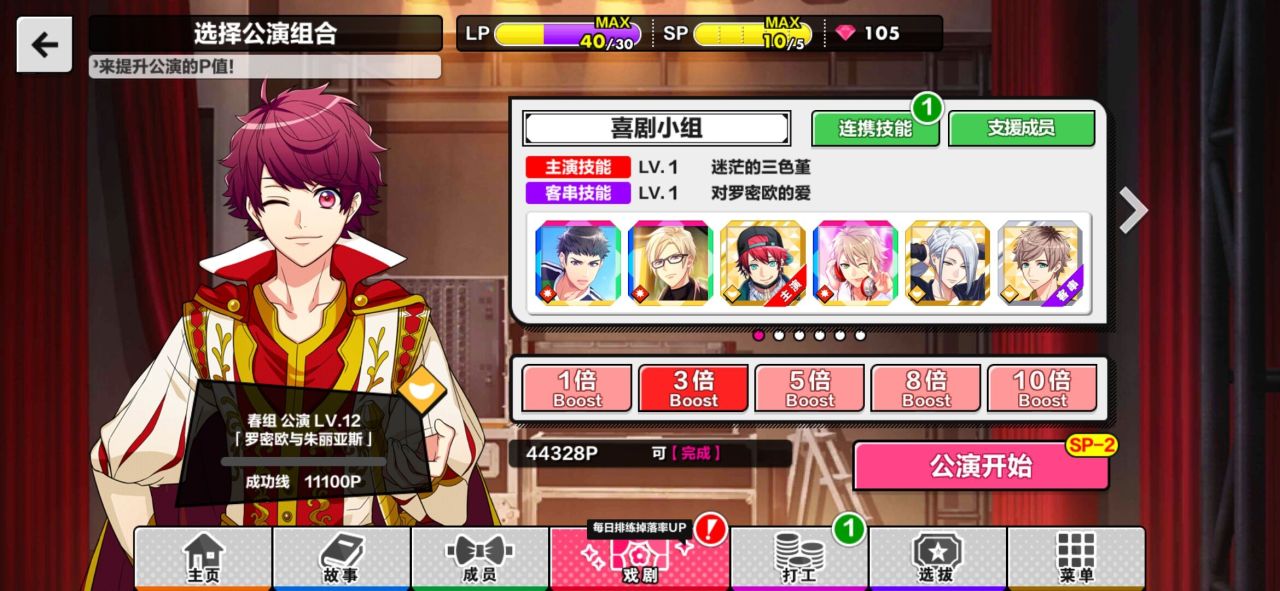 在戏剧界面选择一个你要做的公演,就可以进入了。进入以后大家可以选择出演的小组成员,然后在成员下方有一个boost的倍数值,有1、3、5、8、10的倍数可以选择,从左往右一次消耗一个sp值,最多一次公演消耗5个sp值。