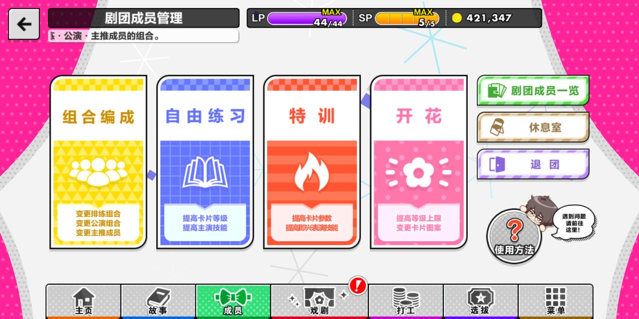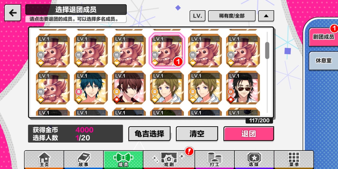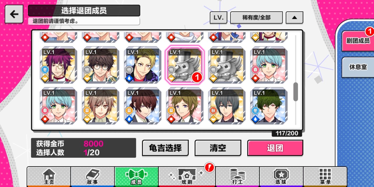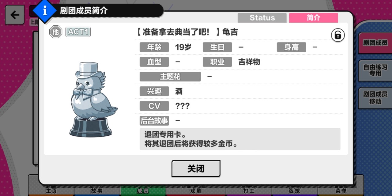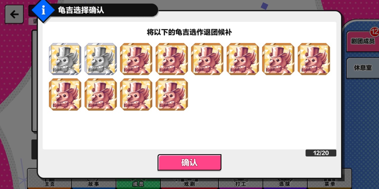 在查看成员页面,点进去可以发现,龟吉的卡面描述上面写着:用于退团,可以获取大量的金币。首先进入成员界面,找到右侧的退团键,也可以手动选择,自己想要退团的成员或者龟吉卡牌,当然也可以使用便捷操作:一键选择龟吉,这样的话可以免除手动点击的操作和误触的风险。随后在下面的确认页面中单击确认即可把剧团内所有的龟吉兑换为金币。