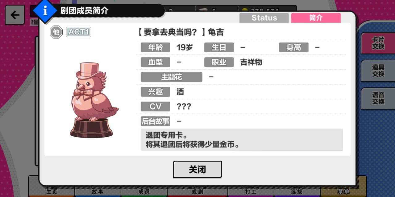 初次领到龟吉卡的玩家会发现虽然是角色卡牌,但是鹦鹉卡牌并不能作为剧团角色在排练和演出副本中编入队伍参与演出,也不能作为剧团成员经验升级的素材在练习界面被选中,那么这种卡牌到底有什么用呢?事实上,该卡牌是消耗型道具,主要用于金币的兑换。金币是在游戏中的一个比较主要的消耗品,因此当金币不够使用的时候,可以查看一下自己的仓库里面是否还有龟吉卡牌,对龟吉进行退团操作,就可以获得大量的金币了。