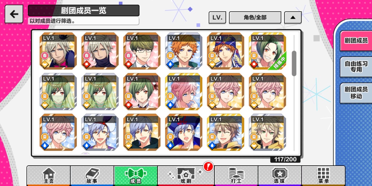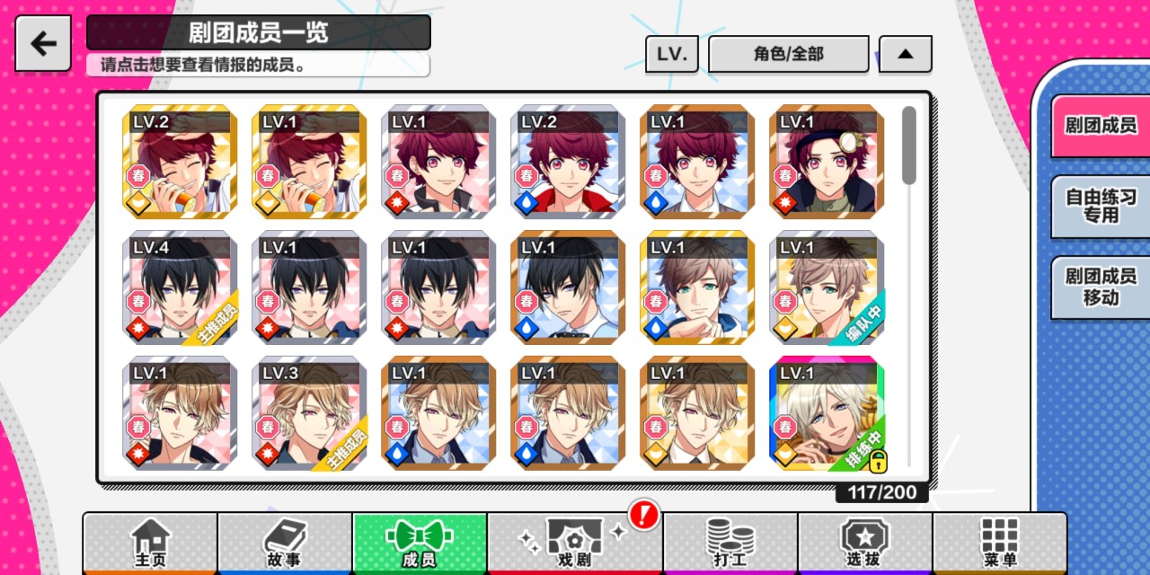 首先第1个方法,进入最右侧的剧团成员一览选项,玩家抽到的所有卡牌都会在这里展示出来,其中也包括重复的。