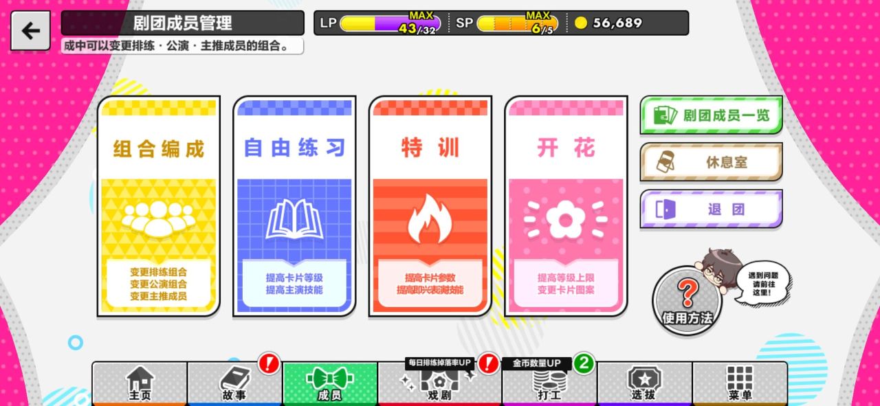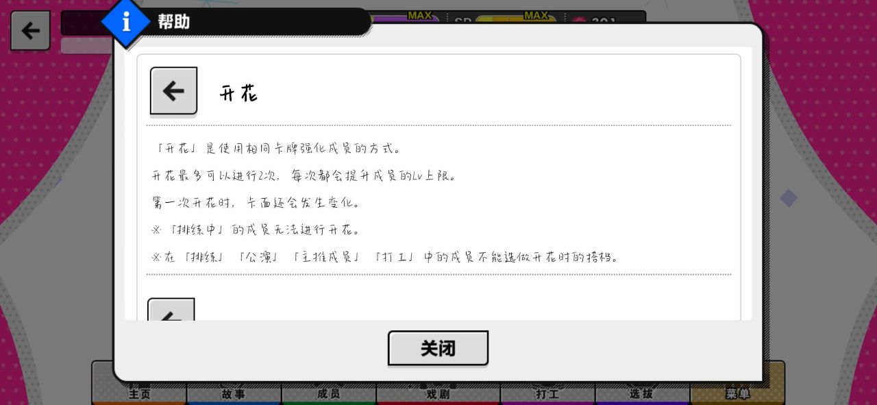 在进行开花之前,需要确保你想开花的成员不在排练,或者开花的搭档不正在进行公演、打工之类的其他工作,否则是没办法参与开花的哦。开花的除了能够强化卡片,也能够提升卡片的等级上限哦。