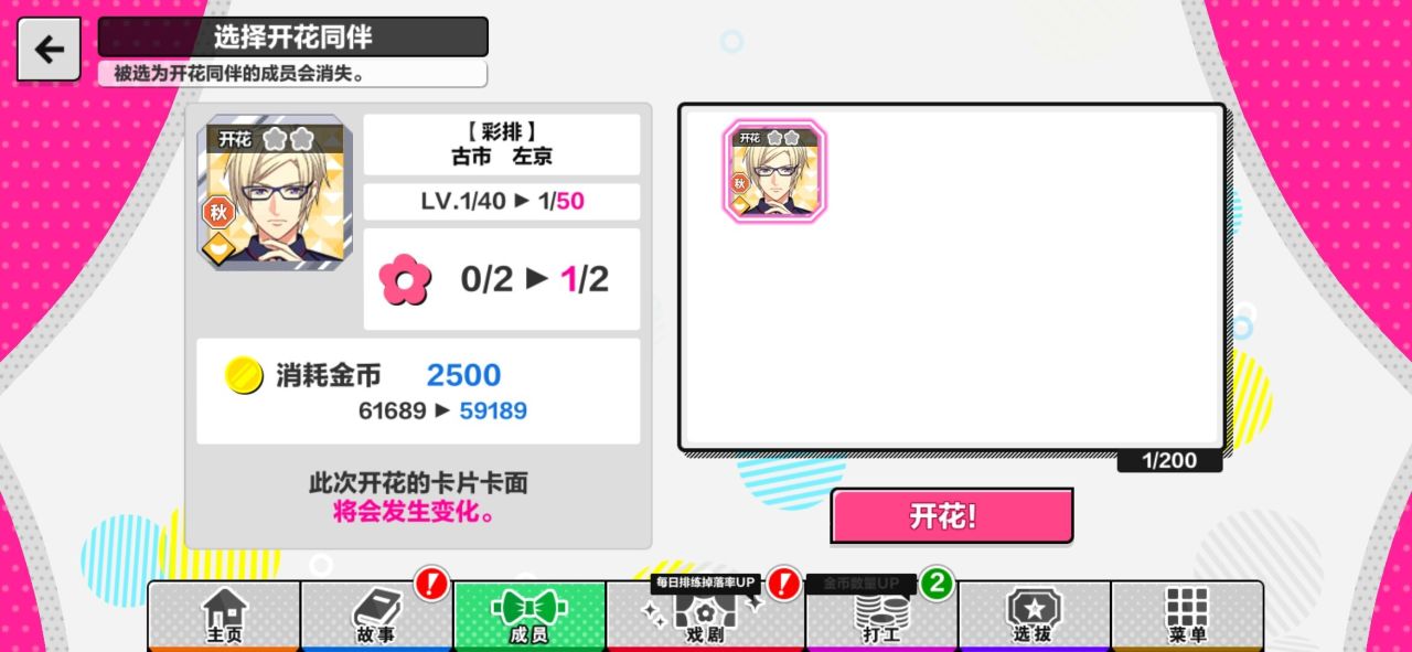 每个成员最多能进行两次开花,第一次开花能够改变卡面的图案。除了n卡和r卡以外不要卖掉开花后的其他卡片,因为这些卡可以升级卡面技能。