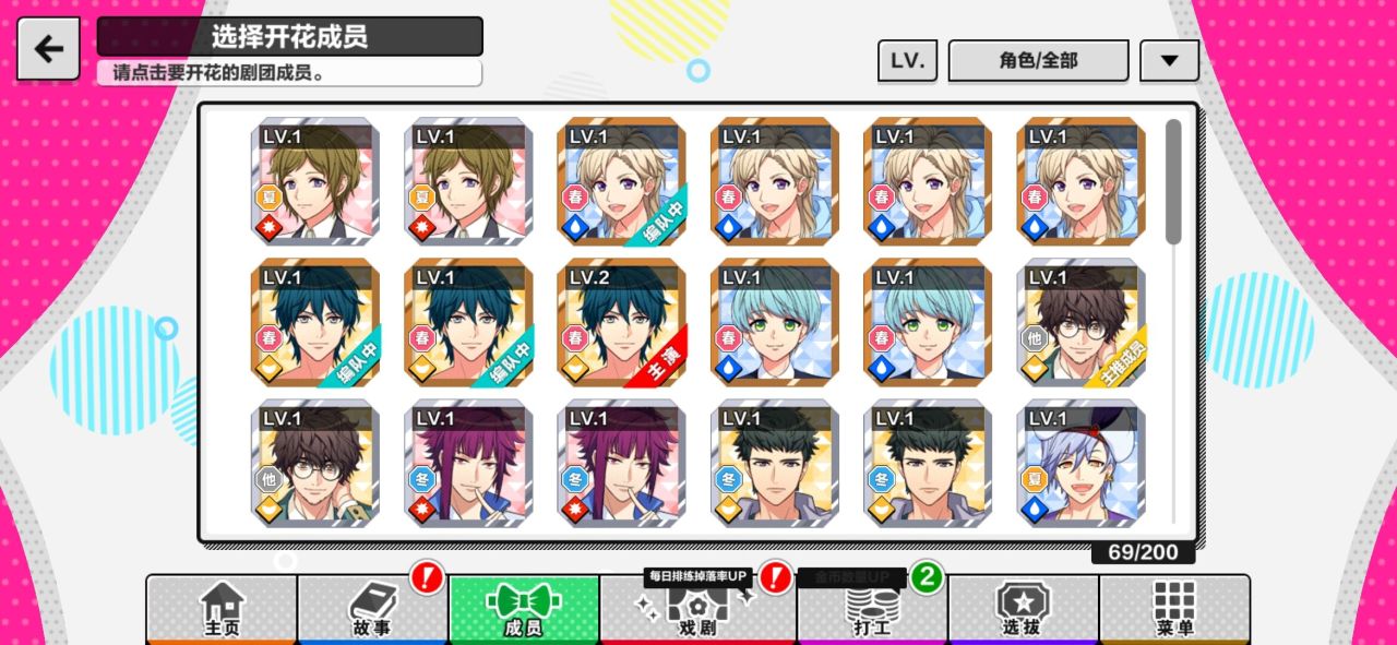 来到"成员"页面后,选择"开花",进入之后只有亮着的卡片才能进行开花,否则就是卡片不足没办法进行。