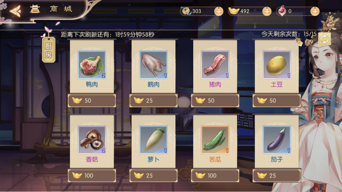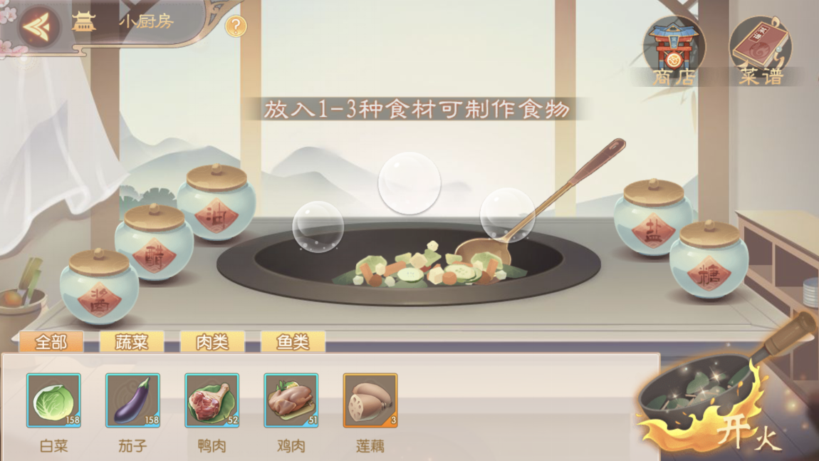 食材分为蔬菜肉鱼类,种蔬菜在菜圃中生长,肉禽在养殖场中生长,鱼在池塘中生长,菜圃-养殖场-太液池的基础产量随等级提升而增加,资源生产周期为一小时。