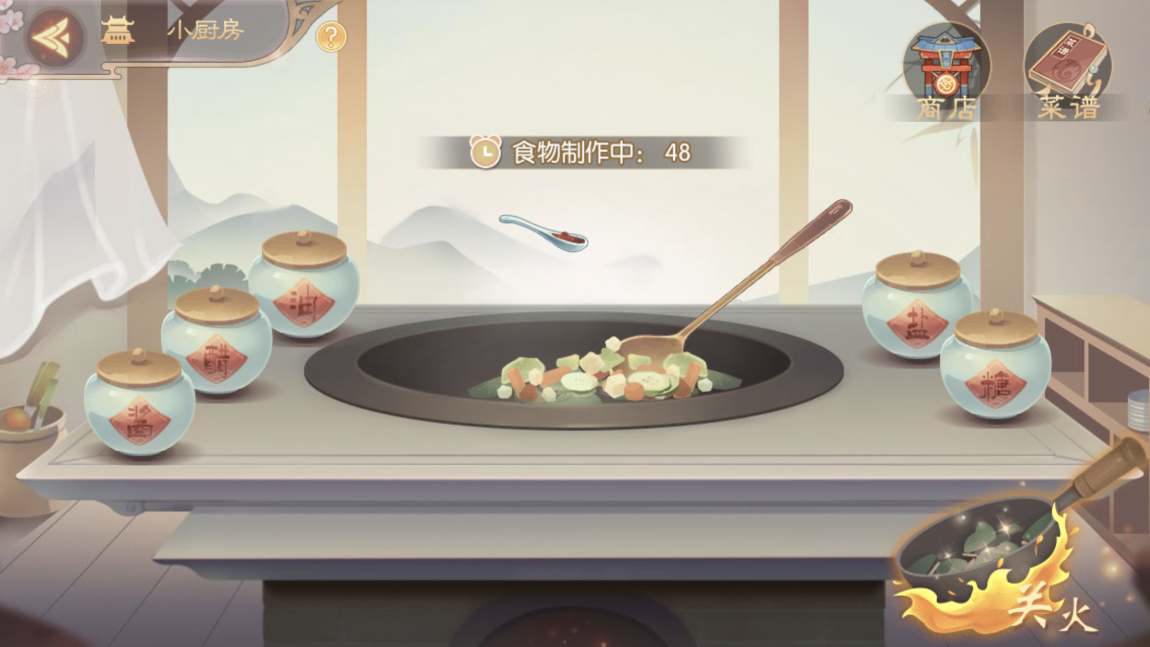 例如我们制作宫爆鸡丁就需要我们食材中有鸡肉。将鸡肉放入锅中点击开火按钮就可以进入烹饪模式。系统将提示火候倒计时我们在倒数计时结束前加入油盐酱。看着火候关火后可以获得宫爆鸡丁。当我们制作的食物获得了三星时就可以批量快捷制作。