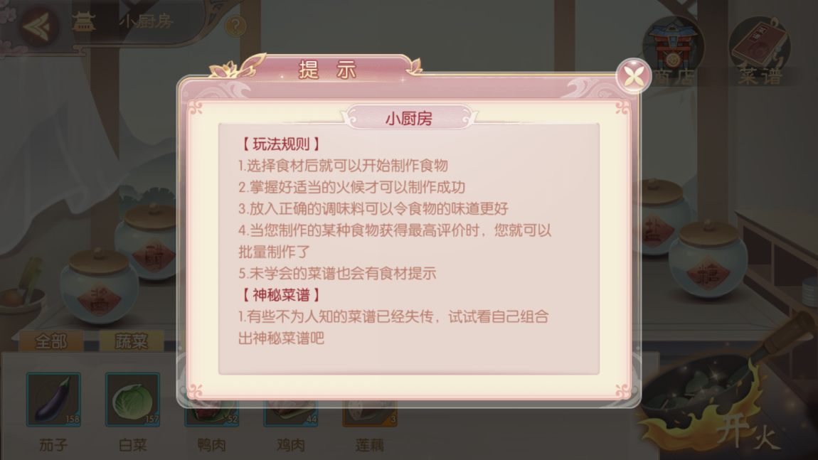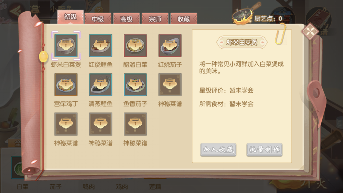 点击右上方的菜谱界面就可以看到我们可以制作的菜谱以及菜品星级评价和所需食材。烹饪时还有机会制作出神秘菜谱中的菜品,这些神秘菜品需要我们不断尝试呦。