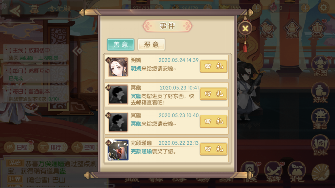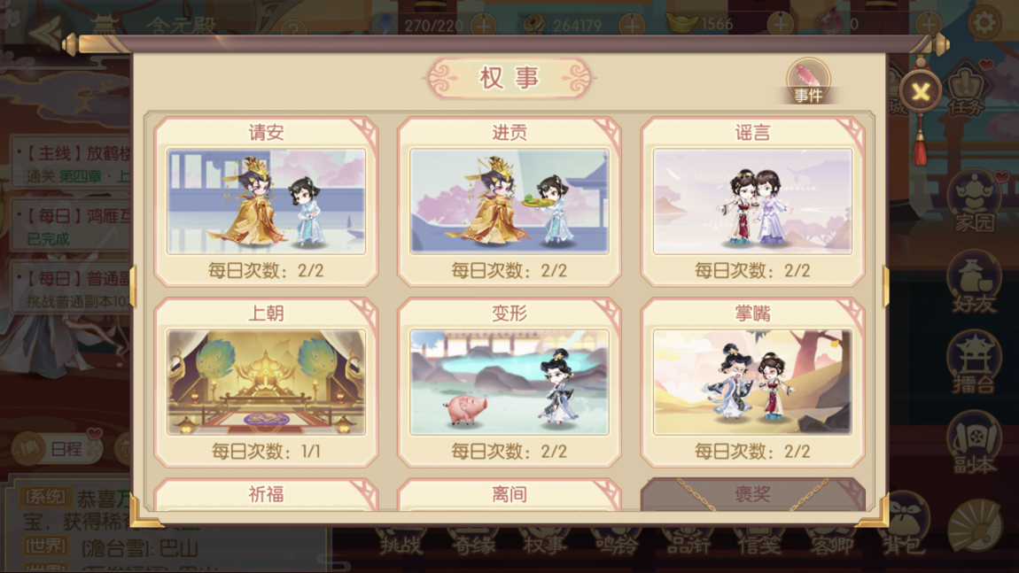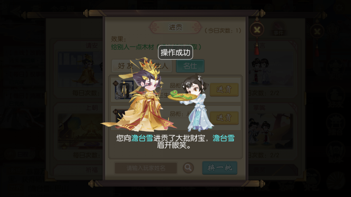 我们根据品衔高低在事权界面可以对其他玩家进行请安-进贡-谣言-上朝-变形-掌嘴-祈福-离间-褒奖-责罚-提携-禁言-大赦天下等事权。
