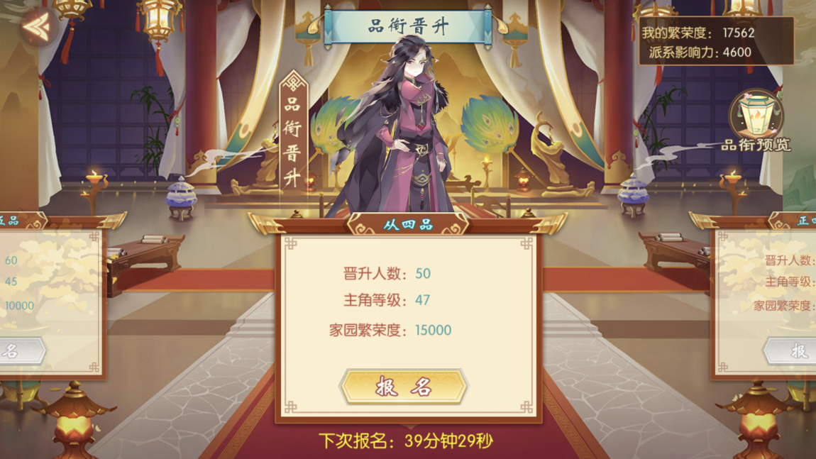 正一品至绝品报名后根据玩家实力晋升。晋升报名需要满足等级和家园繁荣度两个条件才能进行报名。
