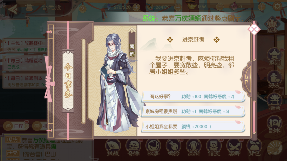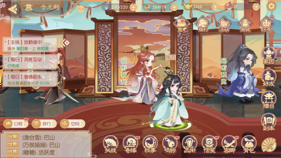 想要晋升品阶就必须去到含元殿,在含元殿力我们可以晋升品衔预览高级品衔的状况,还可以进行擂台比赛或处理日常事务。