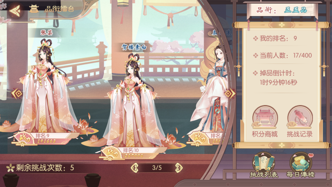 但从六品至从一品根据品阶擂台排名掉品,如从六品人数上限1000人,调品人数200即官品结算时排名在800名之后的玩家就会掉品。
