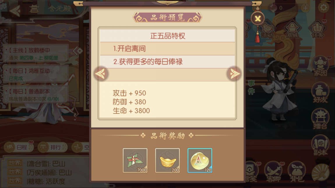 提升官品后可以解锁官权我们可以获得不同的特权以及战斗力加成,例如正五品的特权的为开启离间以及获得更多的每日俸禄。
