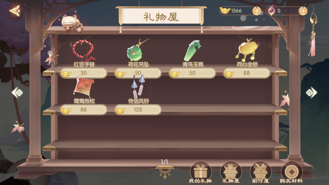 如果材料没有集齐也可以使用少量的元宝购买制作材料,当然也可以直接在礼物屋使用元宝进行购买,成品礼物的价格也会比制作材料更贵一些。