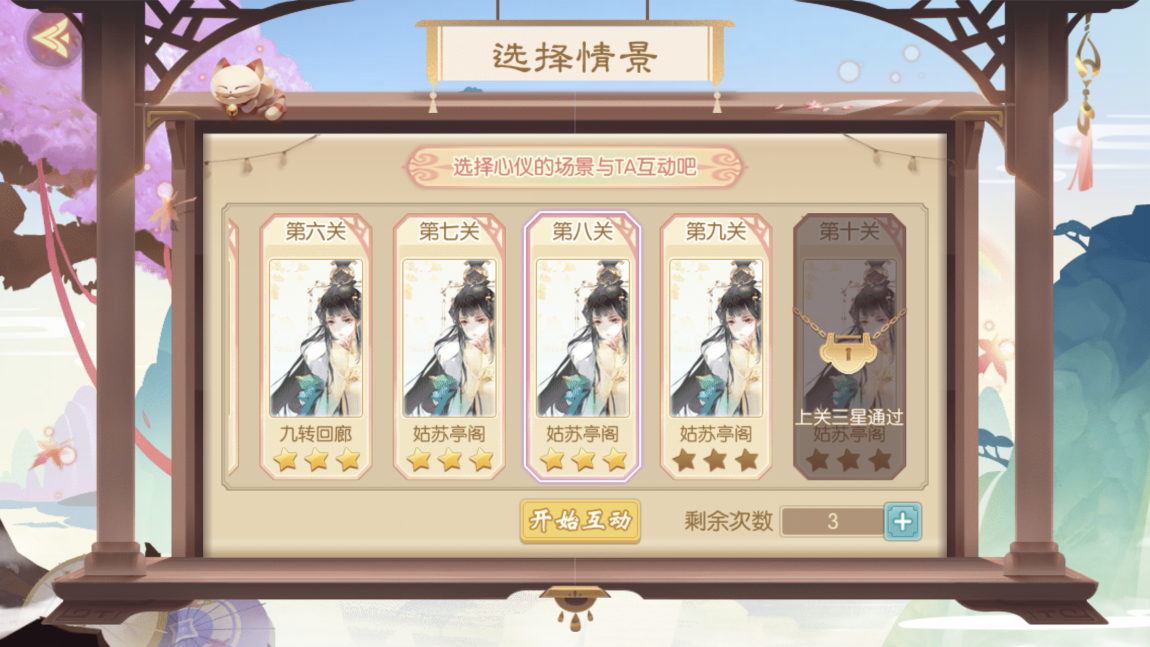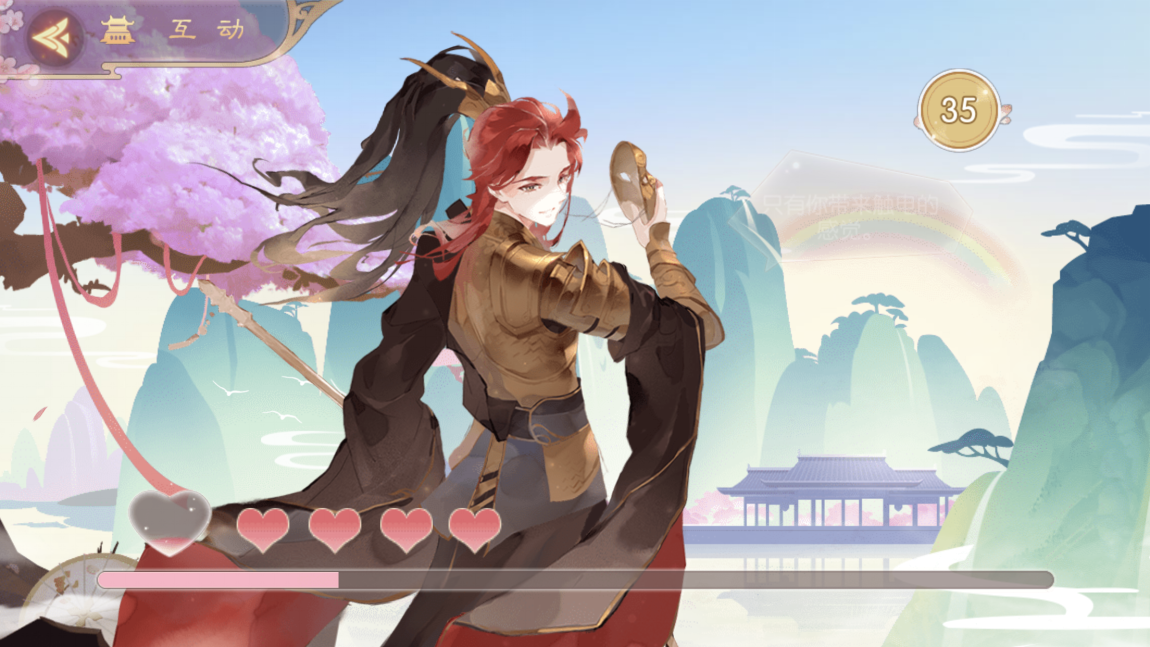 互动分为十个场景,每天可以互动三次,互动成功后才能开启下一个场景,我们需要再四十秒内触碰狄青,触碰位置不同狄青的爱心值不同。