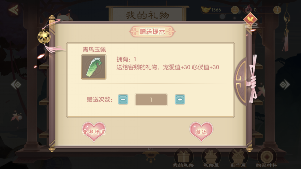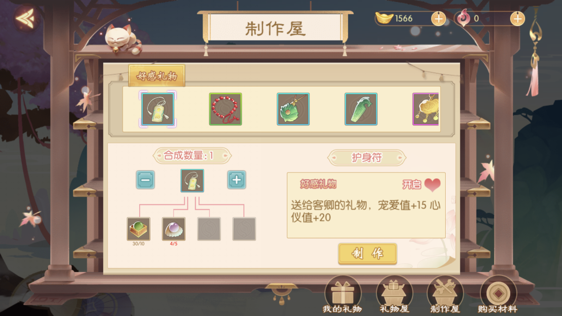 送礼物是快速提升宠爱度和心仪值的捷径,礼物品种很多不同的礼物提升的数值不同,我们可以通过收集制作材料在制作屋中亲手制作礼物。