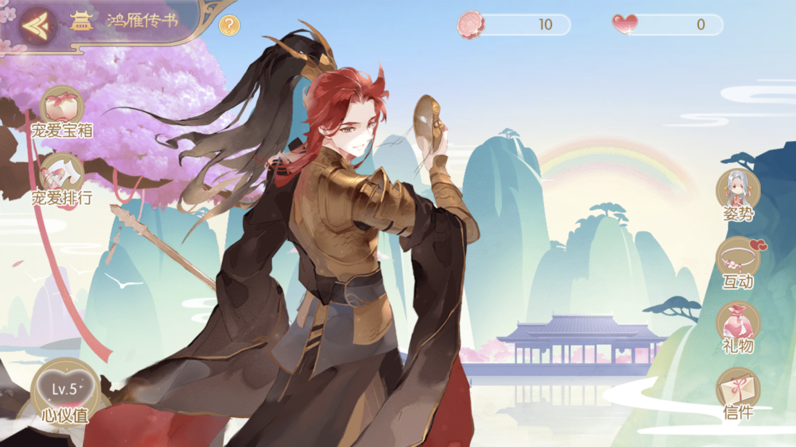 想要提升狄青的好感度就需要进入鸿雁传书界面,提升好感度可以通过姿势-互动-礼物-信件这四种方式获得心仪值和宠爱度,心仪值可以直接提升攻击生命防御属性。